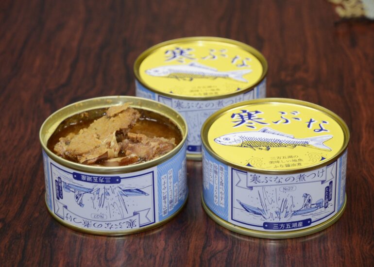三方五湖の三方湖の寒ぶなを使った缶詰が完成しました。400年続く伝統的な漁法「たたき網漁」で水揚げされたふなは、臭みがなく脂がのり刺身でも美味しく、湖の周辺地域